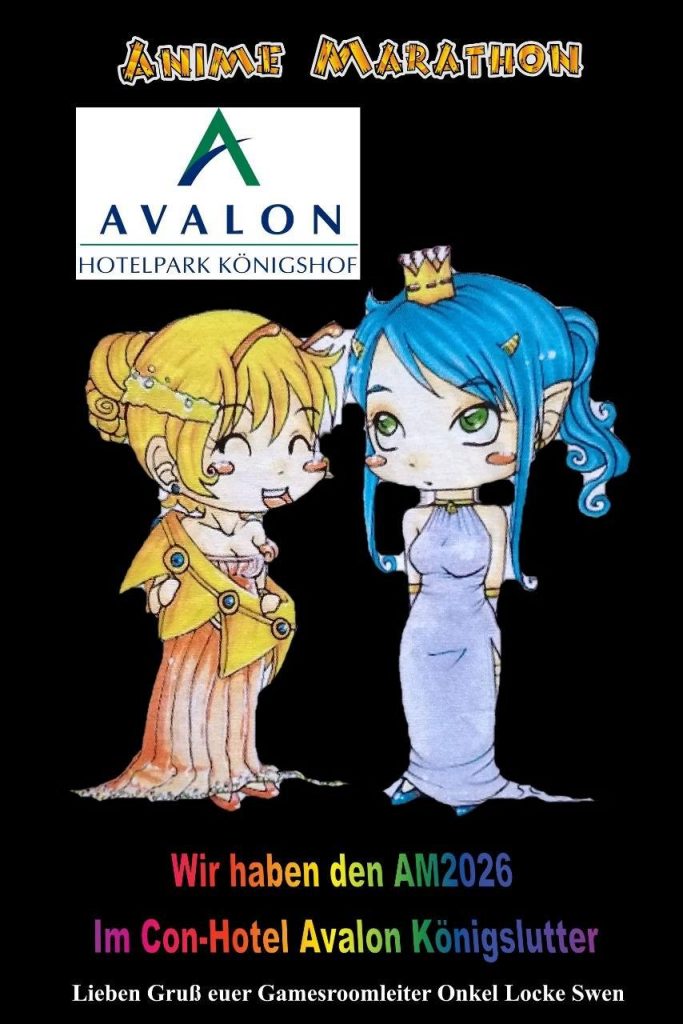Anime Marathon 2026 JPRuehmann, 26. April 2026 Im Con-Hotel Avalon Königslutter Lieben Gruß euer Gamesroomleiter Onkel Locke Swen. 1 0 Anime-Marathon Ari & Oni